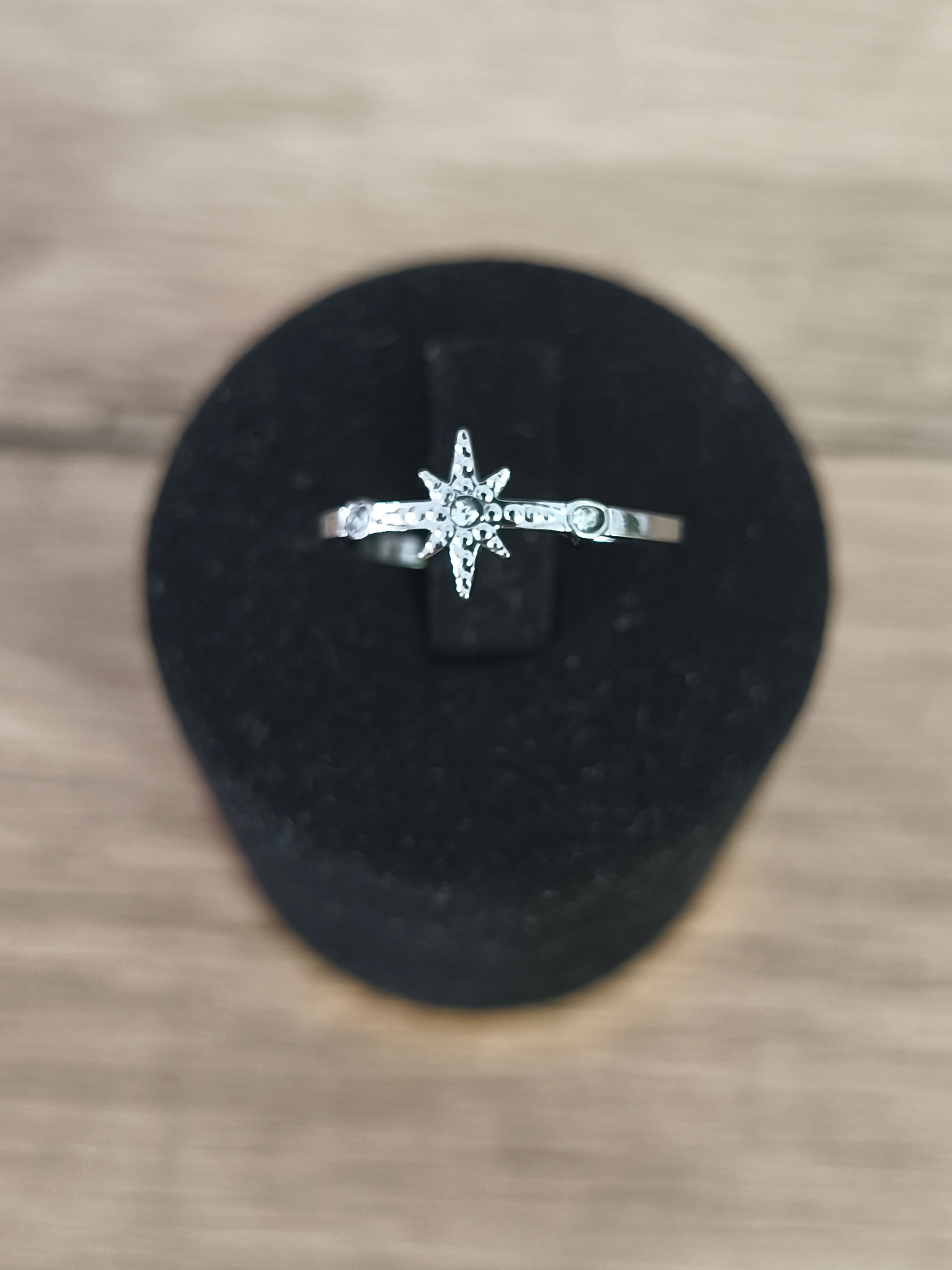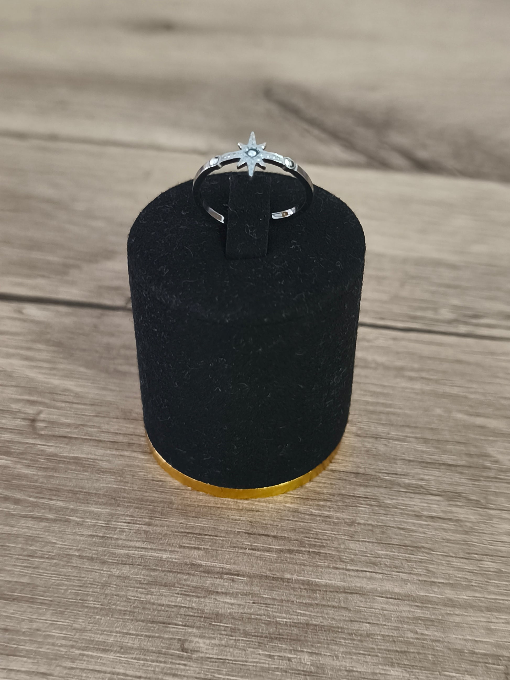 Sublimez votre style avec cette bague en acier inoxydable au motif étoilé. Celui-ci attire les regards, mettant en valeur une petite pierre scintillante entourée de détails délicats.
