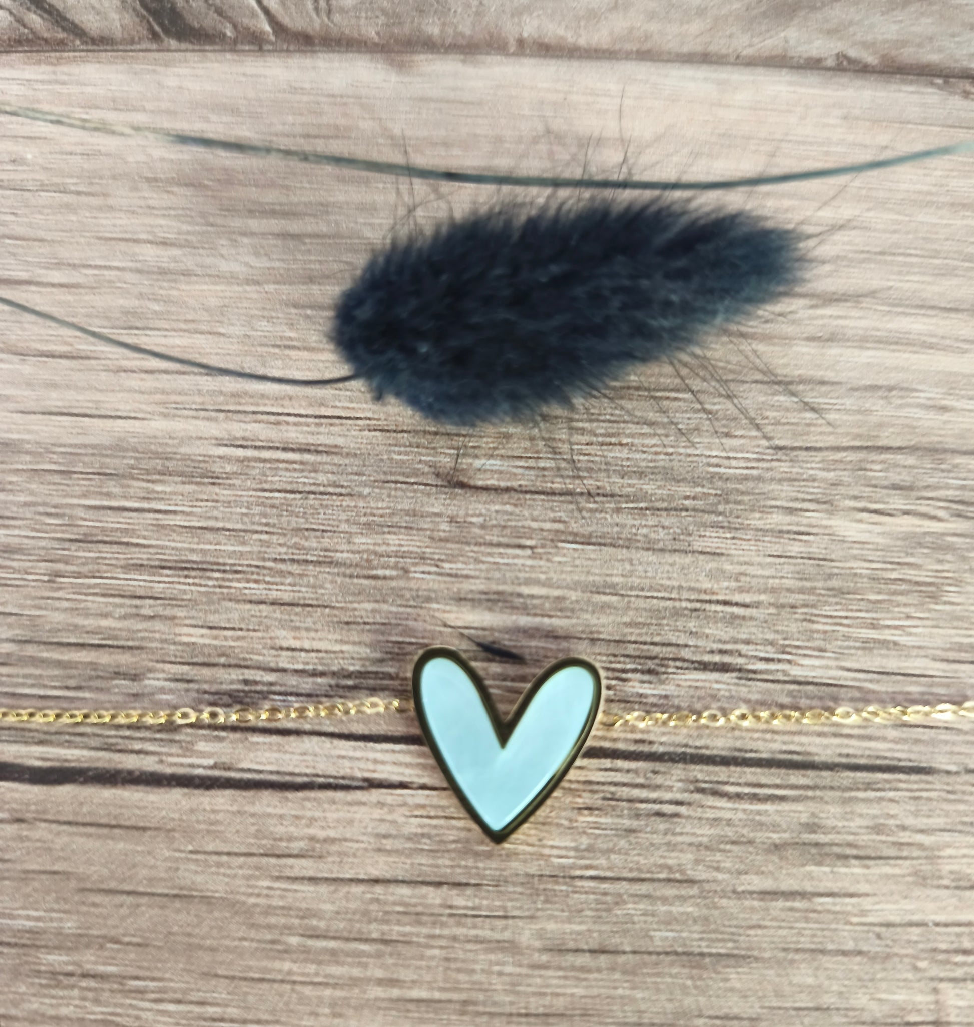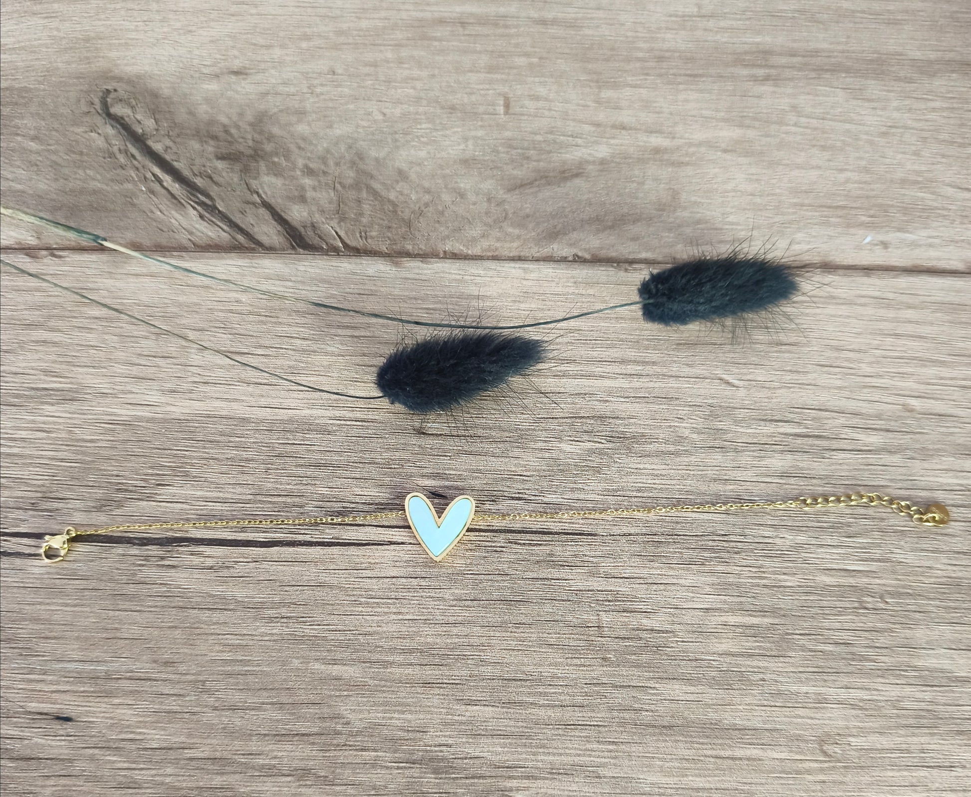 Sublimez votre poignet avec ce bracelet délicat, composé d'une fine chaîne dorée et d'un charm central en forme de cœur stylé, vert d'eau bordé d'or.