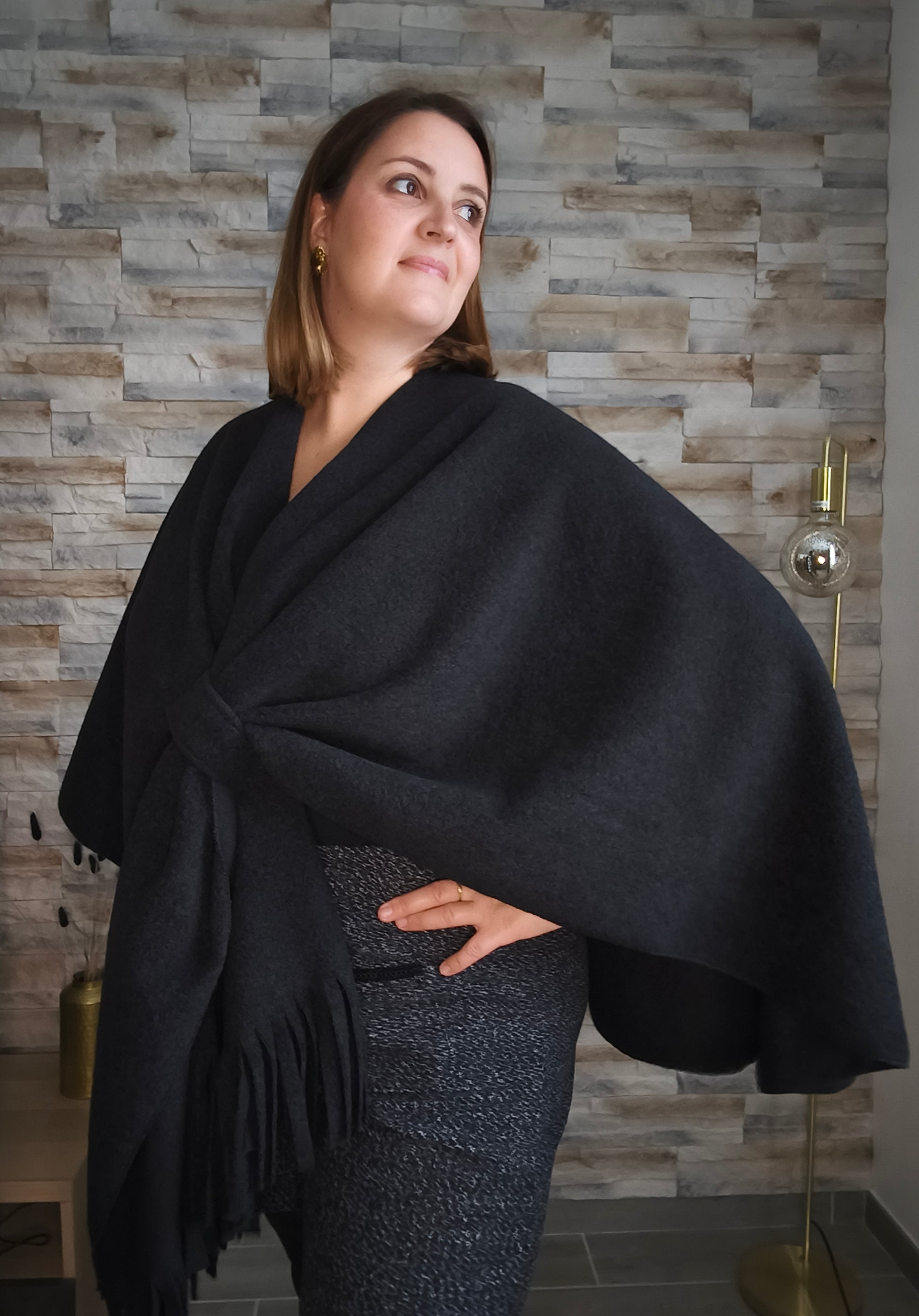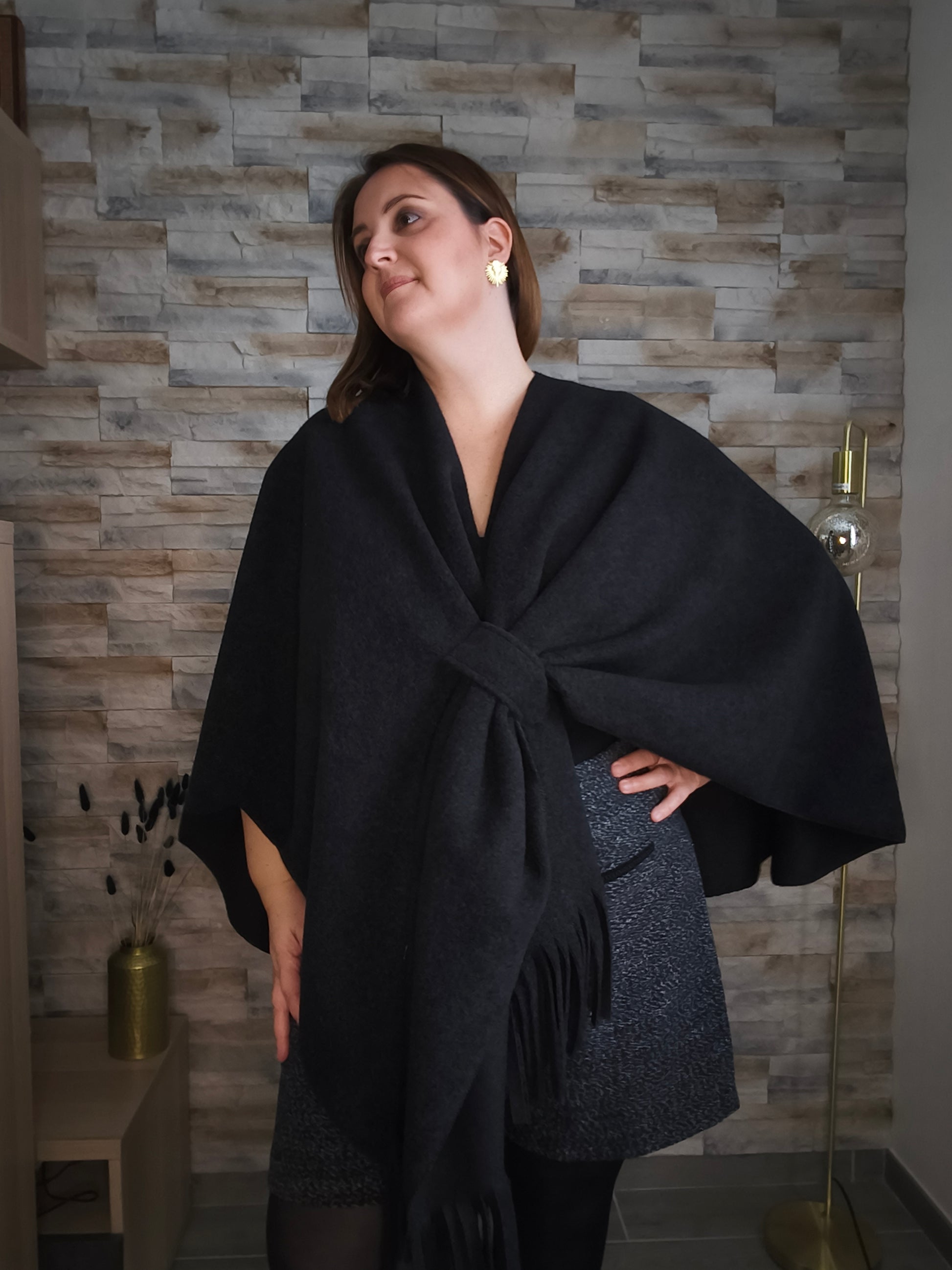 Elégance et raffinement se rencontrent avec ce châle noir noué à l'avant, qui drape délicatement les épaules et les bras. Porté sur une robe ou une tenue habillée, il apporte une touche sophistiquée et intemporelle.