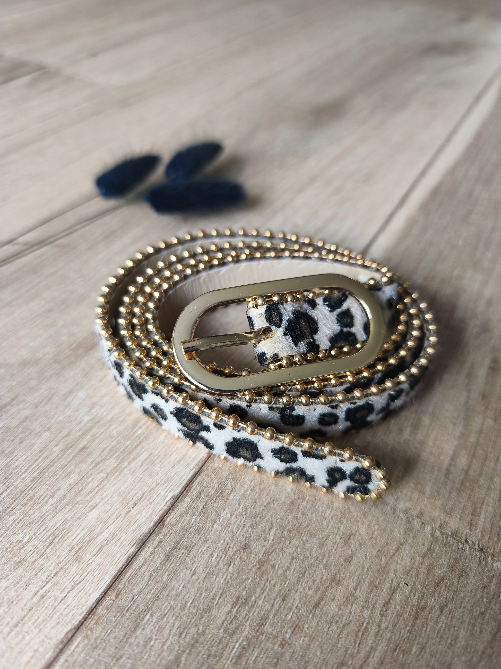 Ajoutez une touche sauvage et élégante à votre tenue avec cette ceinture imprimée léopard, ornée d'une boucle dorée et de perles dorées décoratives sur les bords.