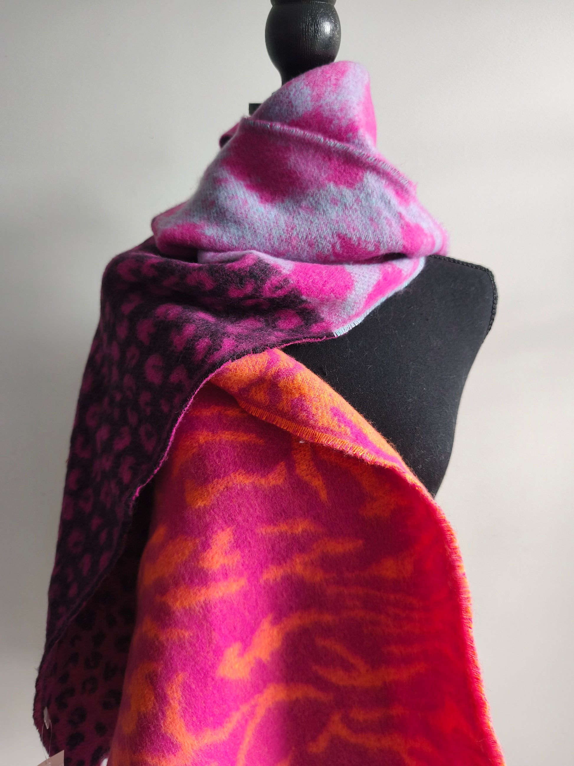 Cette écharpe vibrante associe des couleurs éclatantes telles que rose, orange, violet et bleu clair dans un motif léopard et zèbre. Sa texture douce et duveteuse, combinée à de longues franges épaisses, en fait un accessoire à la fois chaleureux et expressif.