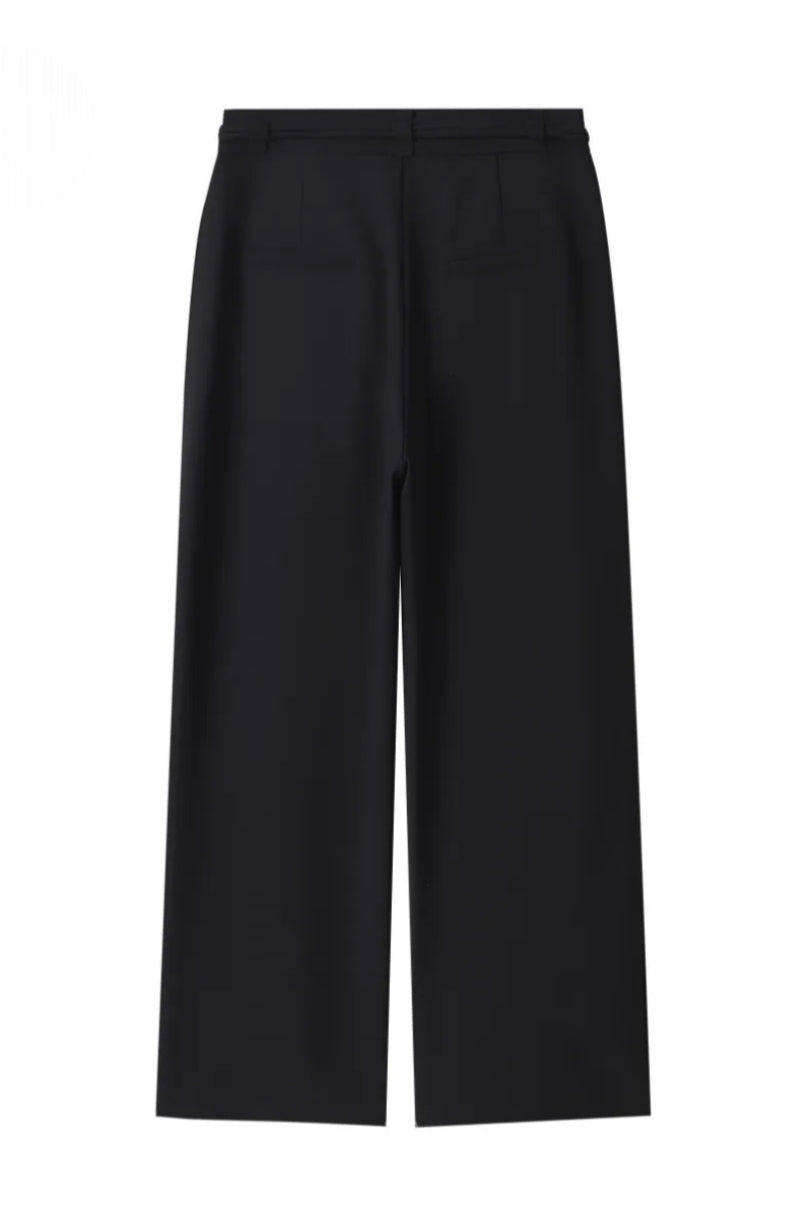 Ce pantalon droit noir à jambes légèrement larges incarne l'élégance moderne. Sa coupe fluide et structurée offre une silhouette sophistiquée, idéale pour un look business_casual ou formel.