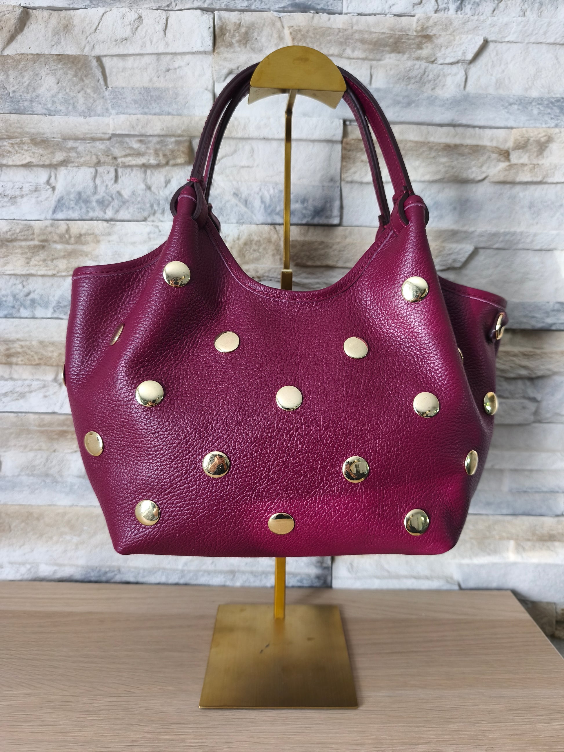 Affirmez votre style avec ce sac à main en cuir grainé bordeaux, sublimé par une série de clous dorés brillants qui lui confèrent une allure à la fois chic et audacieuse.