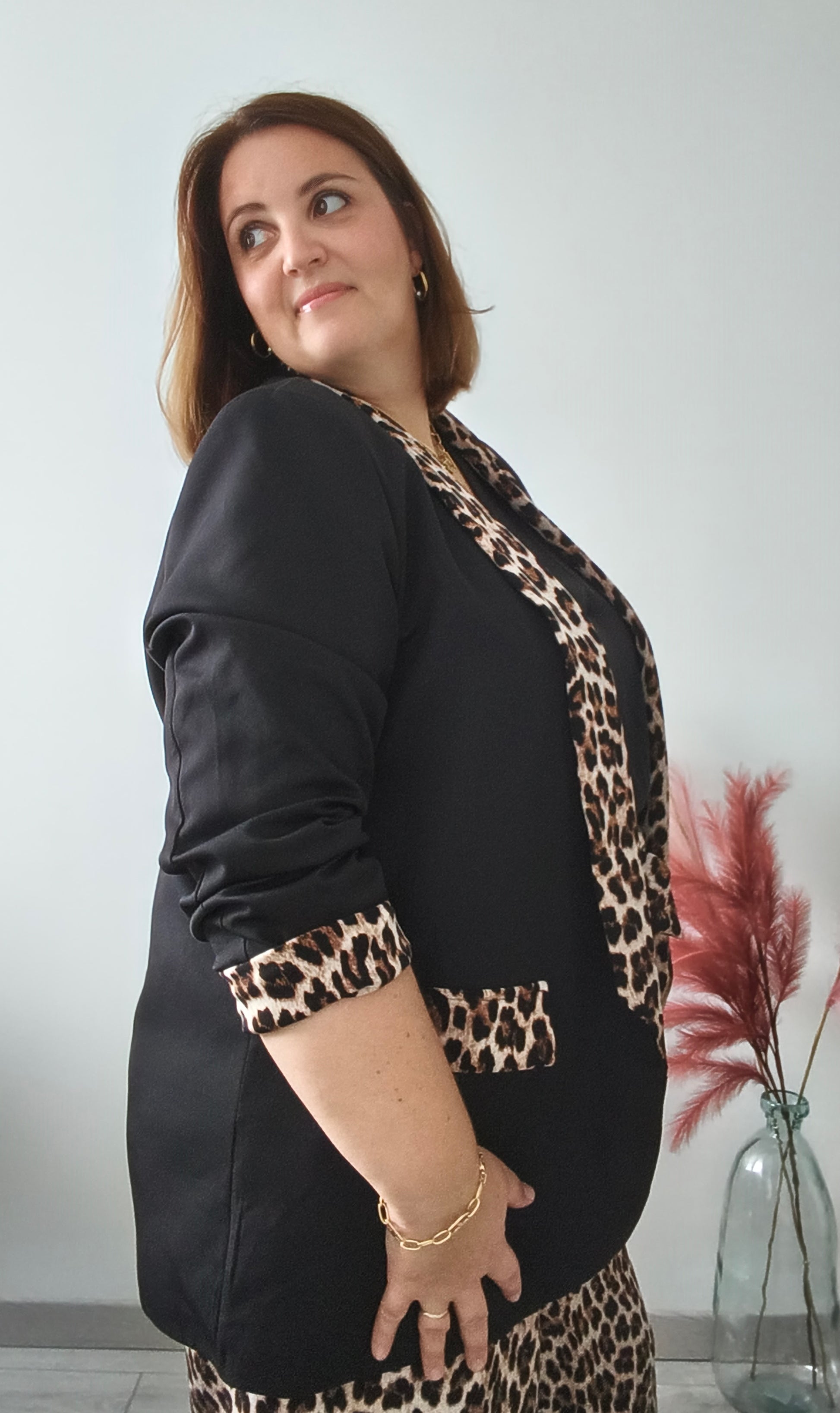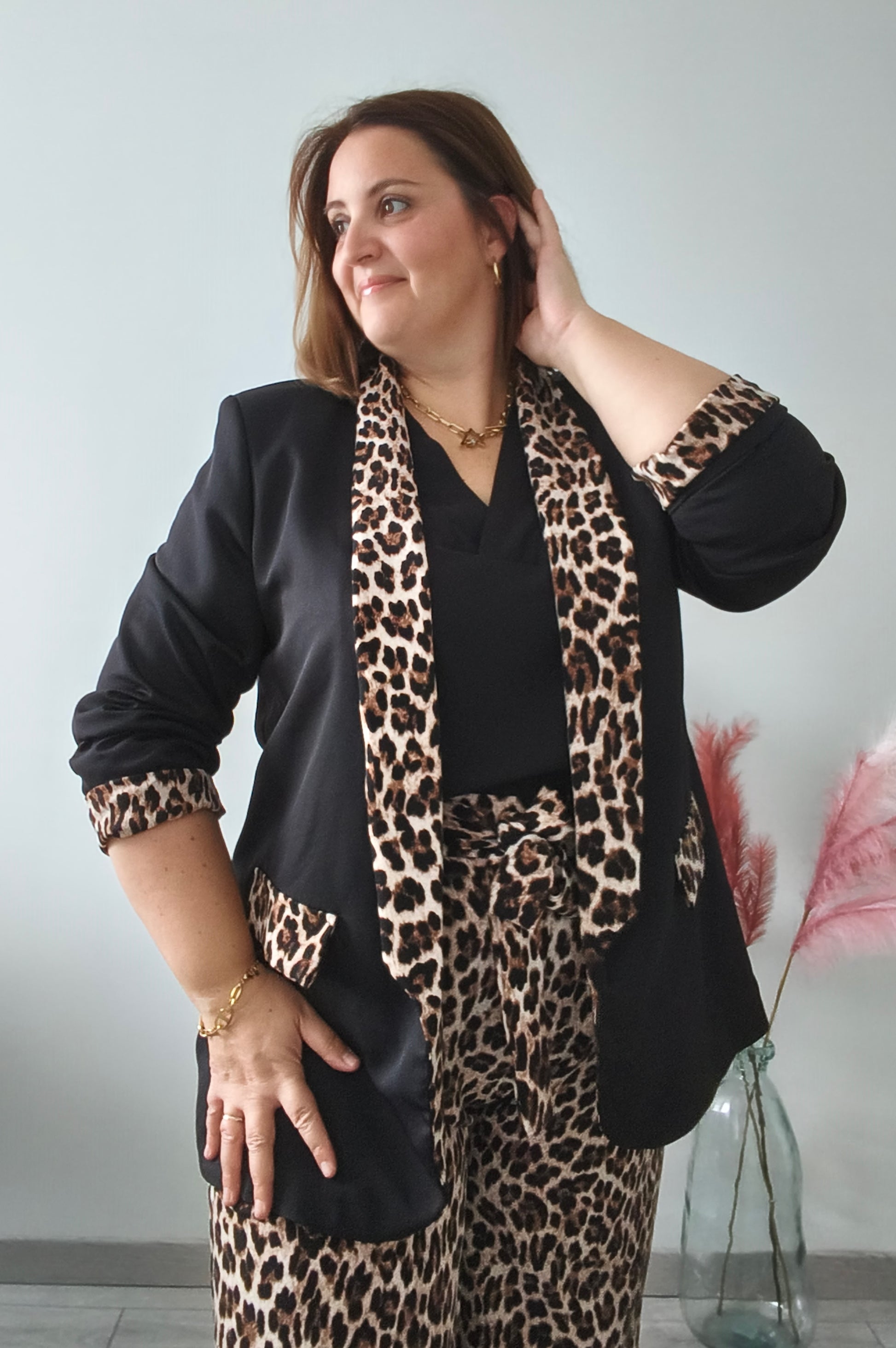 Cette veste élégante combine sobriété et audace grâce à son contraste entre tissu noir uni et finitions à imprimé léopard.